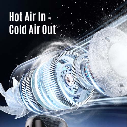 It uses thermoelectric cooling technology to instantly drop airflow by up to 20°C, delivering real relief on hot days.