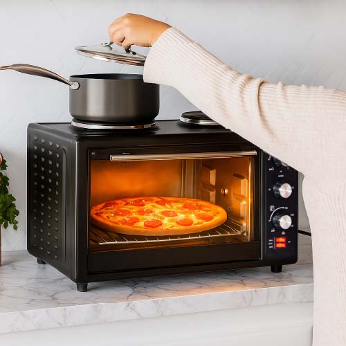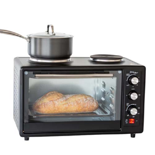 Cook full meals with ease thanks to this clever oven and cooktop in one. The 34L oven heats quickly and efficiently, using less energy than a large oven, and unlike most portable ovens, you can use the oven and cooktop together – bake bread, roast meats or grill vegetables while simmering soup or boiling pasta on top.