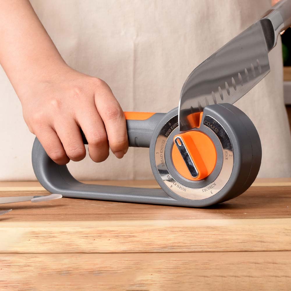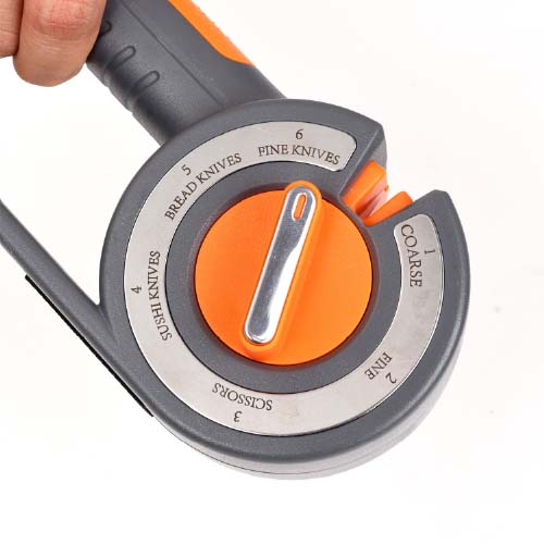 Easy-to-use 6-in-1 sharpener rescues dull blades – saving you money and making food prep faster, and easier. The dial adjusts to a variety of blades (incl. bread knives and scissors), for the perfect sharpening angle.