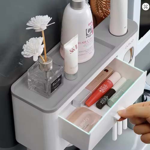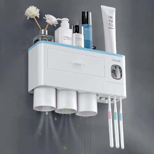 It holds six toothbrushes and three cups, plus has a handy toothpaste dispenser that gives just the right amount with a gentle press.