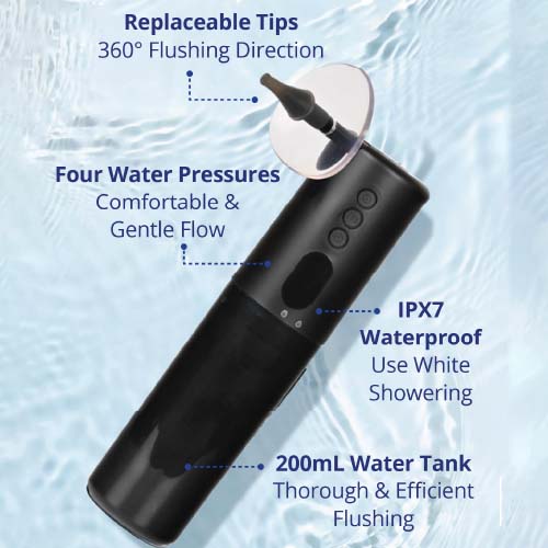 Simply fill the tank, set the flow-rate, and utilise a silicone tip that feels comfortable. 15 assorted washable tips are provided.