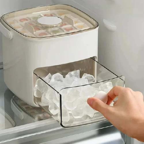The compact 16 x 16 x 14cm unit only uses the shelf space of a regular tray, while protecting ice from debris, and odours.